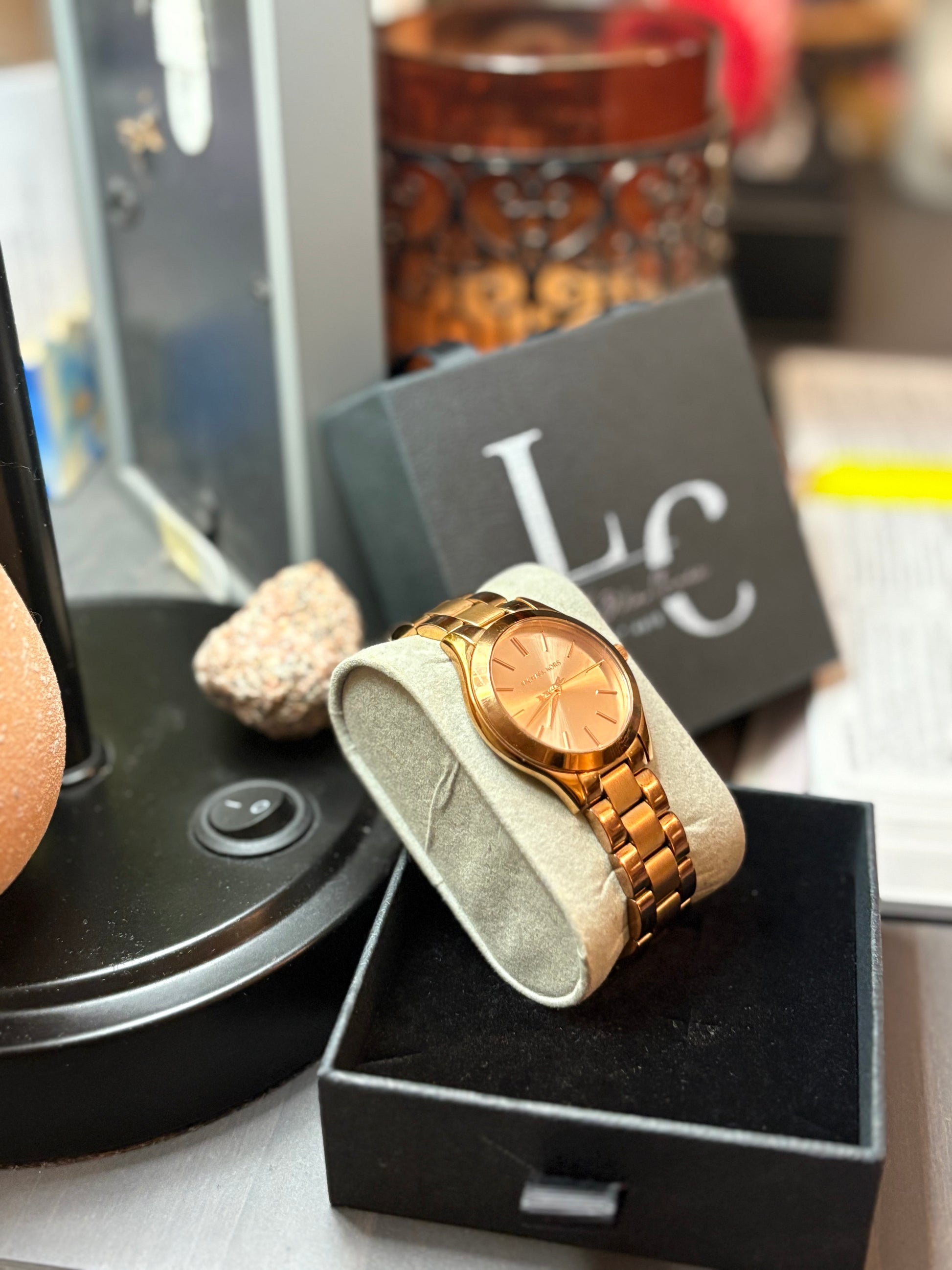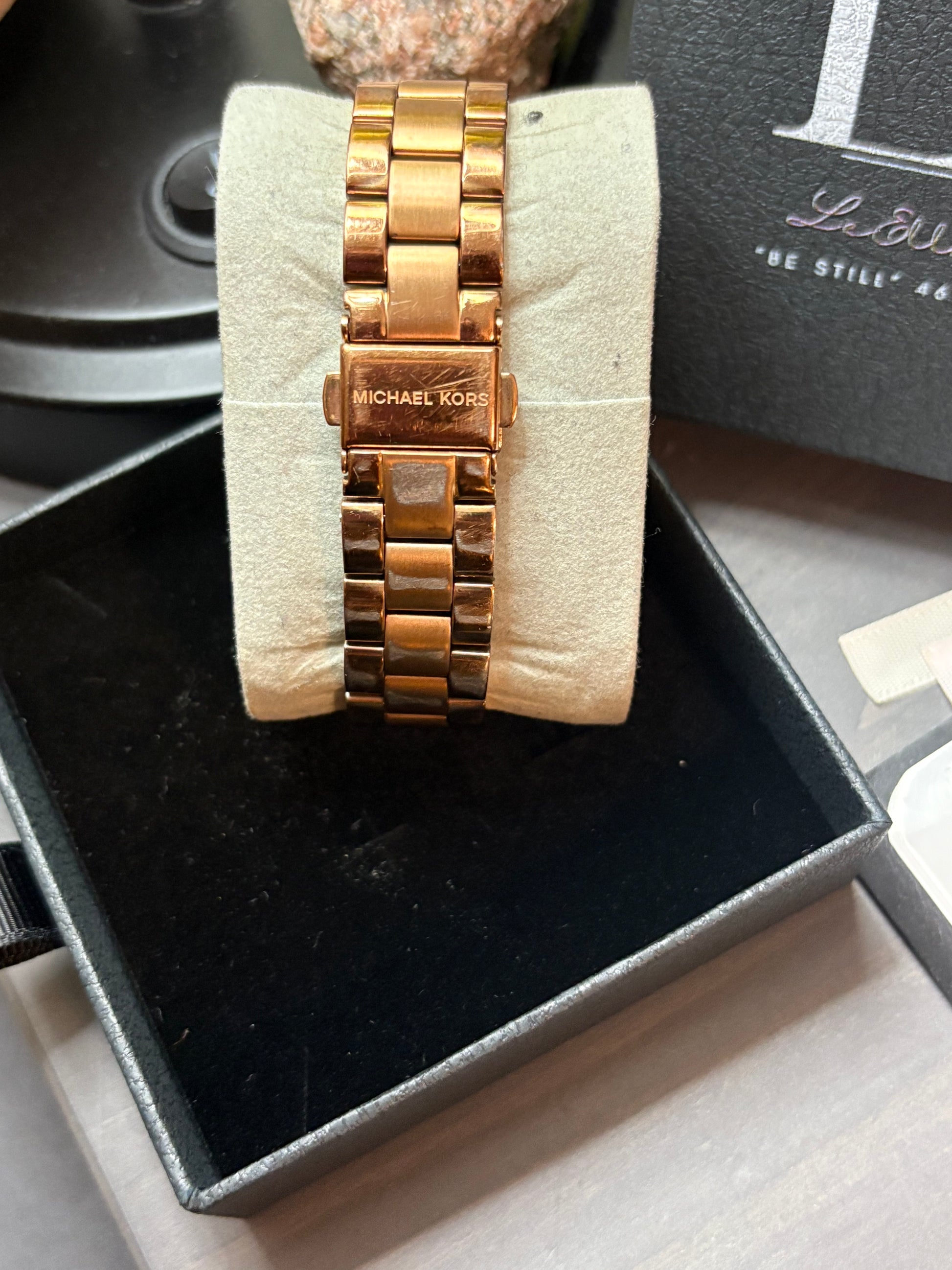 - Rose gold-tone dial with stick indices, three hands and Michael Kors logo