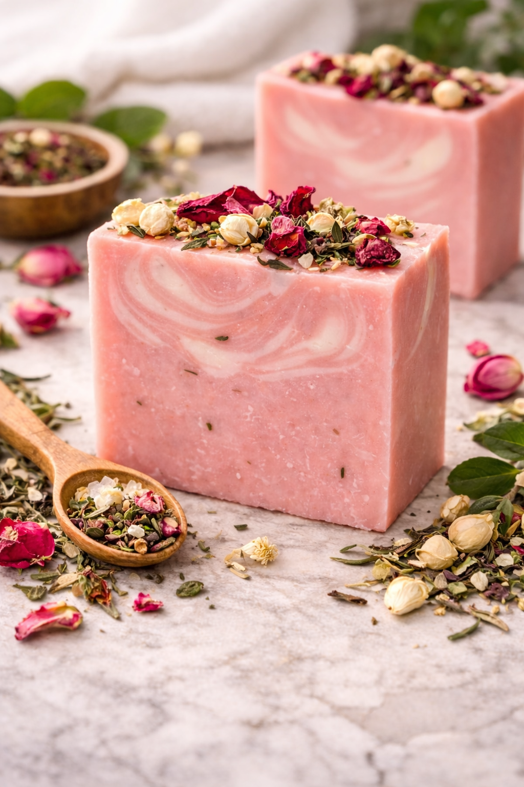 Indulge in the gentle luxury of this Rose & Herb Artisan Soap, handcrafted with nourishing ingredients and fragrant botanicals. Infused with natural rose petals and herbs, it provides a soothing cleanse, leaving your skin soft, hydrated, and delicately scented. Perfect for sensitive skin and a beautiful addition to your bathroom decor.