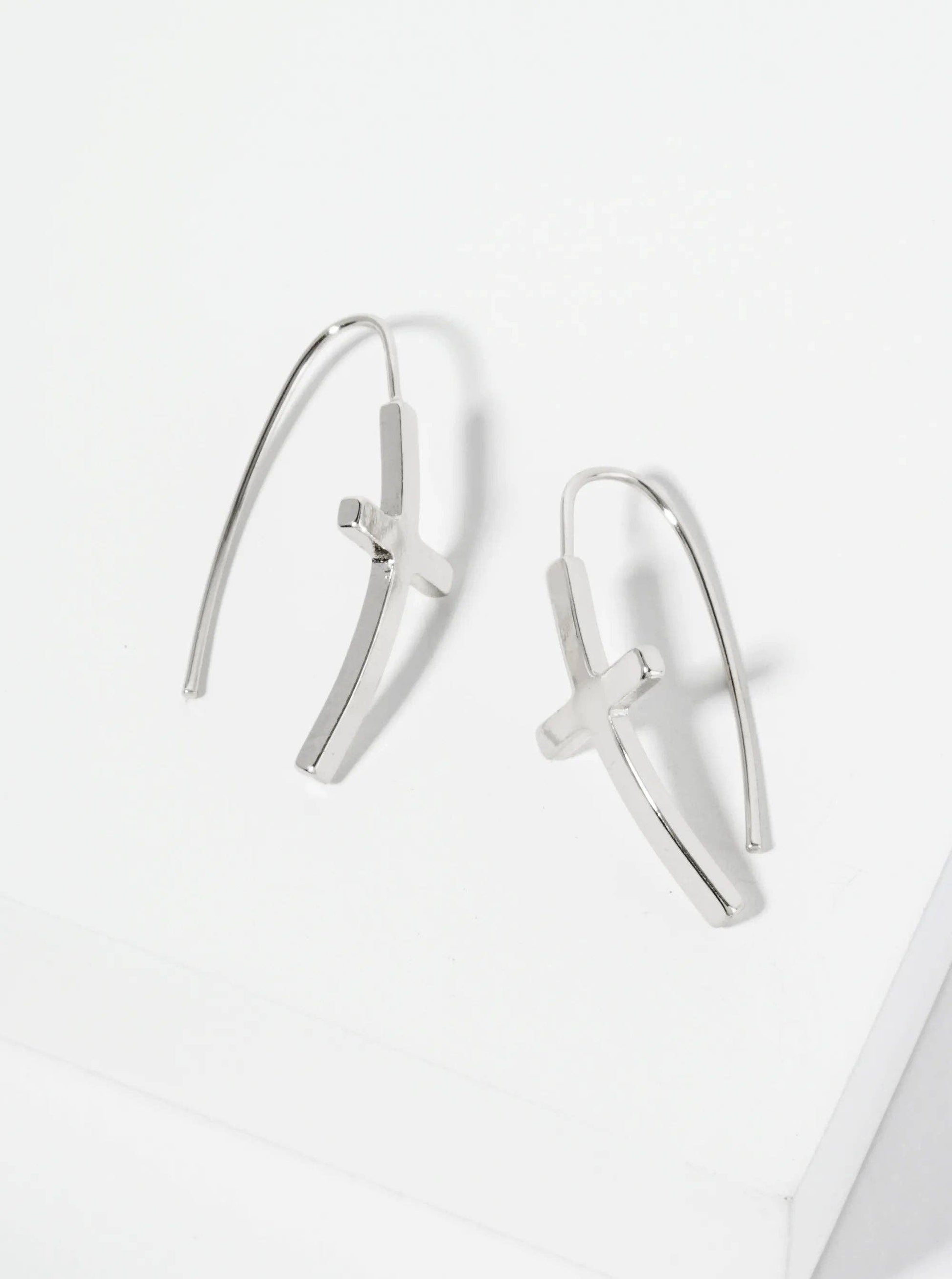 Polished Silver -Rhodium Cross Drop Wire Hook Earring