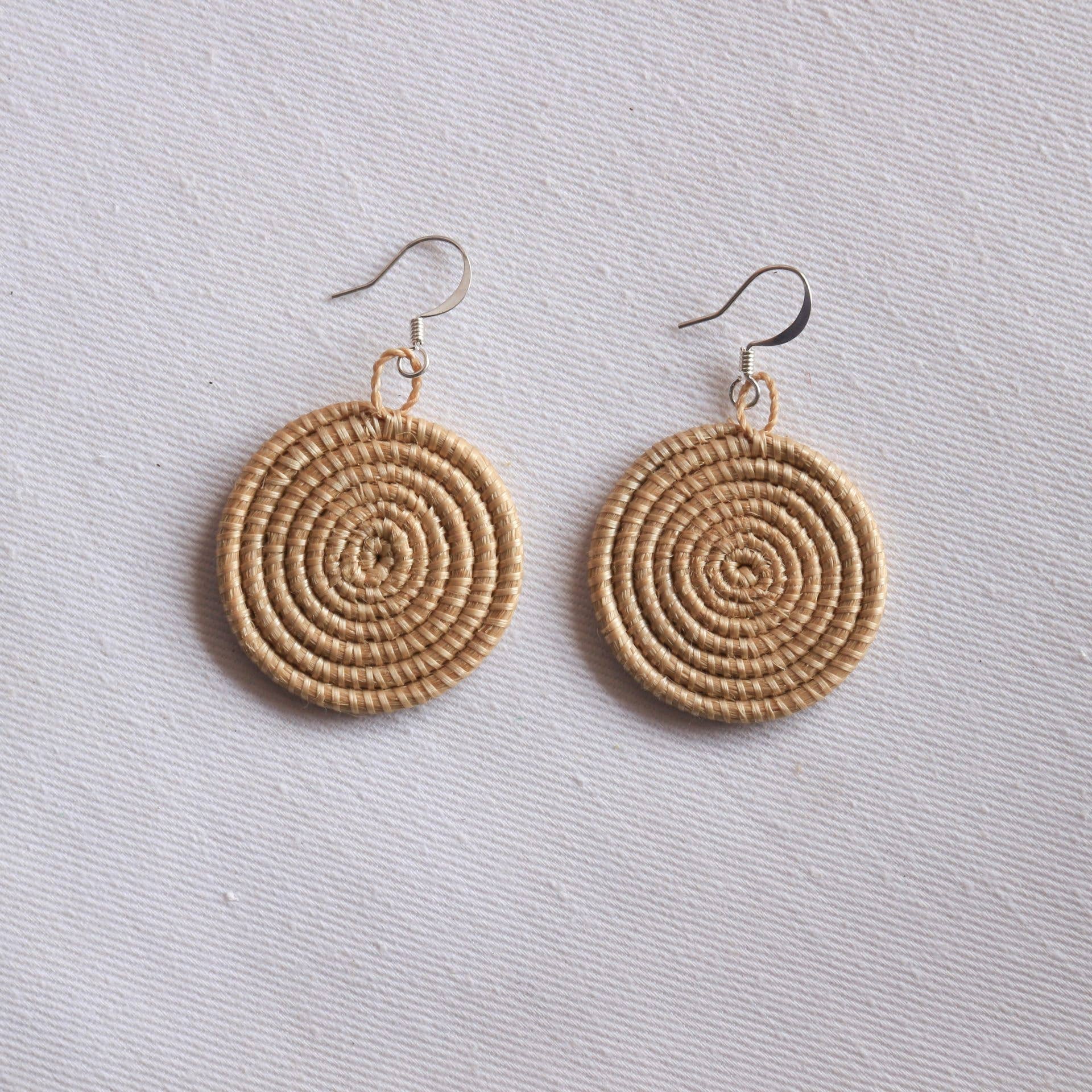 Lightweight and fun to wear, these statement earrings are woven from natural sisal fibers. The weaving technique is taken from the age-old craft of weaving traditional Rwandan baskets. The large discs add a great splash of color and style to your outfit, and provide an opportunity to share your love of fair trade with everyone who tells you how much they like your earrings!